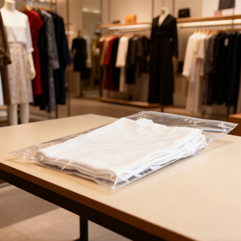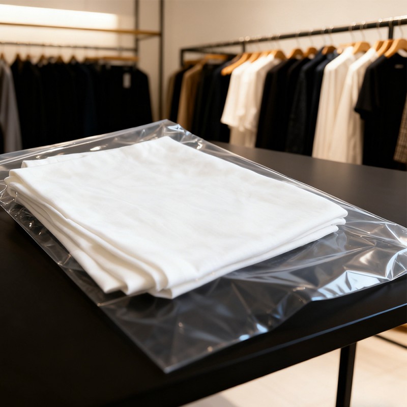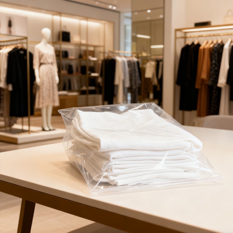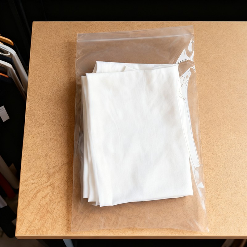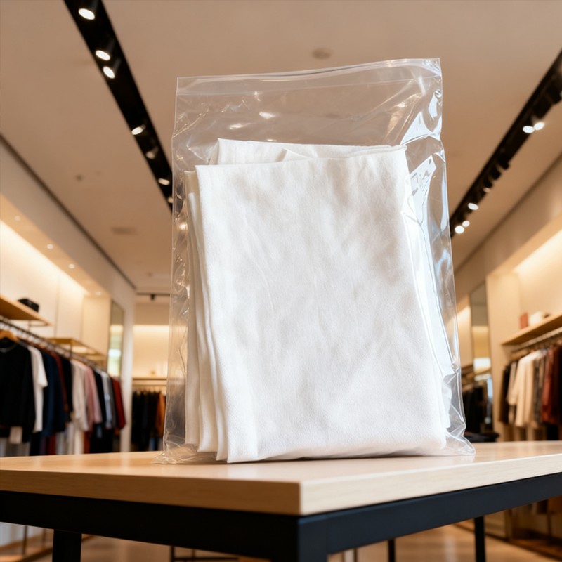 Proteção de roupas: Nossas bolsas de PE podem servir como uma barreira confiável contra poluentes comuns. Eles evitam efetivamente a entrada de poeira, sujeira e umidade durante o armazenamento e transporte. Isto garante que as roupas, desde a seda delicada até às refrescantes camisas de algodão, desde os armazéns até às mãos dos clientes, possam ser mantidas limpas e arrumadas. Visibilidade clara: A transparência do material de polietileno proporciona excelente visibilidade do produto. Ele pode mostrar totalmente a cor, a textura e o design das roupas e ajudar a identificar rapidamente o estoque sem abrir cada sacola. Superfície Não Impressa: Como não há impressão, não há necessidade de se preocupar com a contaminação da tinta do produto, o que elimina o risco de manchas ou marcas desagradáveis no produto. Certifique-se de que eles tenham uma aparência impecável quando abertos na embalagem. Esse recurso é crucial para roupas brancas, de cores claras ou de alto valor. Os clientes também podem utilizar outros métodos para diferenciar os produtos de acordo com suas necessidades. Também pode ser utilizada como embalagem universal para venda. Durável e resistente a perfurações: Apesar de sua textura leve, o material PE possui excelente resistência e resistência ao rasgo. Ele pode suportar os rígidos requisitos de manuseio, embalagem e transporte, reduzir o risco de danos à sacola e garantir a segurança de seus produtos em toda a cadeia de abastecimento. Economicamente Eficiente e Leve: Estas bolsas alcançam um equilíbrio entre desempenho e economia. Seu peso mais leve ajuda a reduzir os custos de transporte, tornando-os uma escolha economicamente sensata para empresas de todos os tamanhos, desde pequenas boutiques até grandes fabricantes. Tamanhos personalizáveis e vedação fácil: personalizável em qualquer tamanho, adequado para todos os produtos, desde meias e acessórios até vestidos e jaquetas compridas. Esses sacos podem ser fornecidos em rolos para embalagem automática em alta velocidade ou em sacos individuais para uso manual. Eles possuem fita dupla-face autoadesiva segura para uma vedação rápida e fácil.