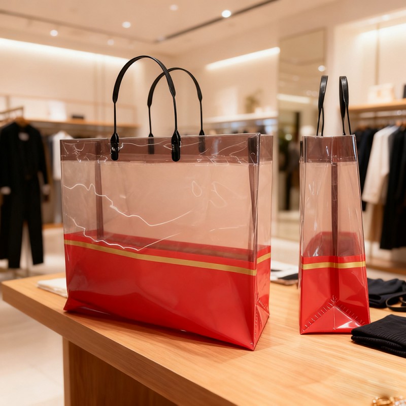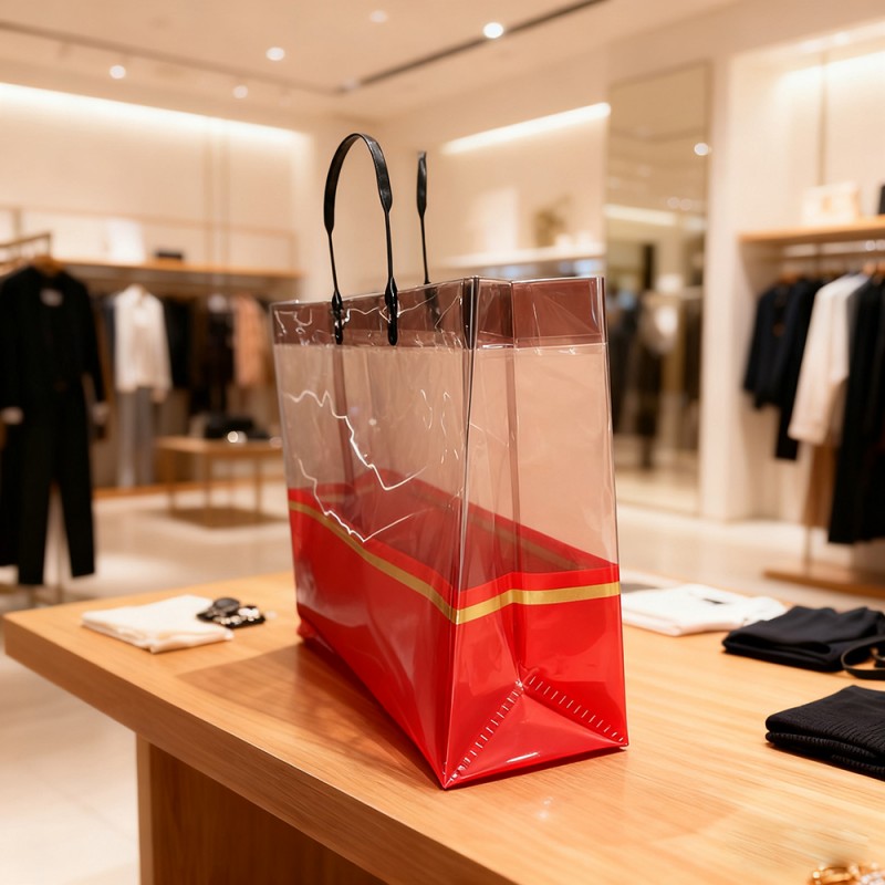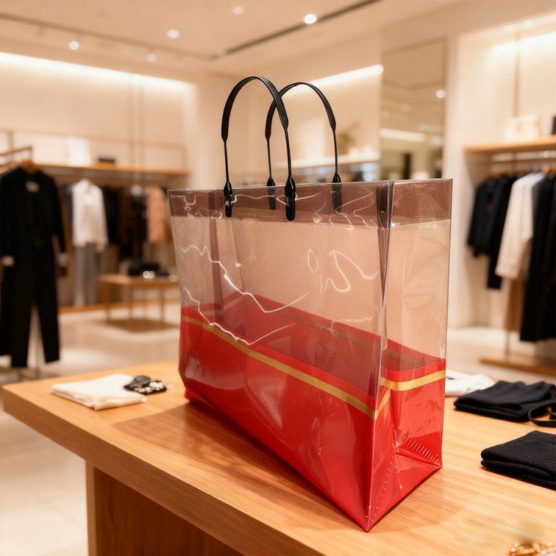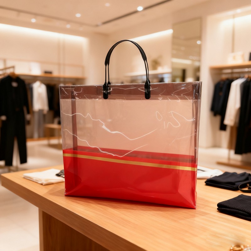 Boutiques de varejo e moda: Ideal serve como uma sacola de compras de luxo para roupas, acessórios e cosméticos. Aumenta o valor percebido da marca e melhora a satisfação do cliente através de sua aparência premium. Presentes corporativos e eventos: perfeito para embalar conjuntos de presentes, itens promocionais ou brindes em eventos. A decoração da faixa dourada combina com o tema das marcas de alto padrão, tornando-a adequada para promoção corporativa. Uso diário e viagens: Leve e dobrável, a bolsa serve como uma companheira elegante para compras, passeios na praia ou passeios casuais. Sua transparência permite fácil identificação do conteúdo e conveniente para o uso diário. Exposições e Feiras: Funcionam como propaganda ambulante quando customizadas com elementos da marca, atraindo a atenção na distribuição de materiais ou amostras. Ajuda na visibilidade da marca e no envolvimento com clientes em potencial.